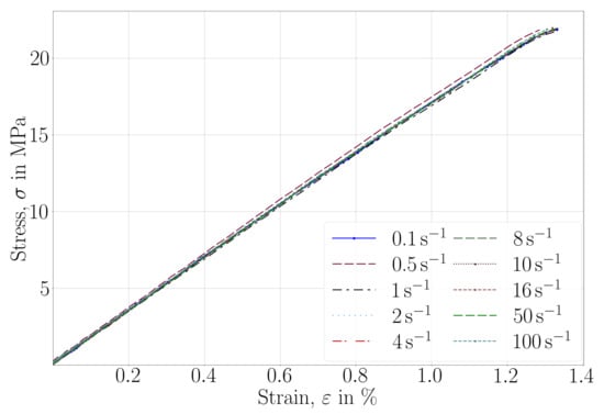 The material was expected to be elastic. We provide the stress-strain curve of ISO 527-2 (performed with a ramp speed of 2 mm/min) in Figure 8. A linear elastic stress-strain response is observed up to 20 MPa and between 1 to 1.5% strain. A bare-eye visual inspection qualifies the cross-section of failure as a brittle crack. No plasticity occurred in the specimens. In order to determine its possible viscoelastic character, several uniaxial tests were performed on ISO 527-2 specimens with the aforementioned (displacement controlled) equipment. The maximum force was chosen by performing several measurements, and we show herein results up to 20 MPa equivalent stress. The strain rate dependencies are compiled in Table 7 with their corresponding stress-strain curves in Figure 9.