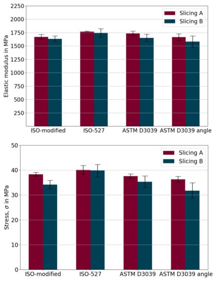 where the relative standard error, R in percent, is obtained by the standard deviation, S, and the arithmetic mean of all samples, m. By we denote the value of the ith point in the data set, where is the mean value of all samples and n is the total number of data points. Relative errors of the elasticity modulus and maximum stress are quantified in Table 8. By comparing the Slicing A and B settings, obviously the Slicing A performs better than the Slicing B regarding the obtained errors less than 2%. Figure 10 (top) and Table 8 (left) show that deviation is small in determined Young’s moduli among all specimen types. However, there are slightly higher deviations in maximum stress results with more errors in Figure 10 (bottom) and Table 8 (right). As seen from Table 8, slicing settings have a more significant impact on the accuracy than the chosen specimen type according to ASTM or ISO. Hence, we conclude that all specimen types are adequate for obtaining Young’s modulus. However, this fact changes in the case of the ultimate strength, as the error range is affected by the specimen type as well as the slicing approach. As expected, the effective mechanical properties of 3D-printed polymers are less than molded structures [68,69]. Processing conditions like low interlayer adhesion and occurring porosity within the structure are understood to be the main reasons for this outcome.