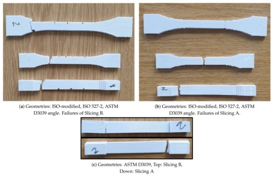 Tabs are necessary to provide an adequate clamping and curvatures are of interest to distribute the stress appropriately. However, slicing may cause some problems in the transition zone between clamping edges and gauge. As observed in many cases, the slicing software begins the production from the clamped edges and finishes these areas before continuing to the rest. This situation is depicted in Figure 3b as a result of the Slicing B, where three edges were produced initially. Obviously, the right side of the specimen had different characteristics than the left side caused by a heterogeneous solidification. The rods and layers did not connect to each other very well because of the temperature difference on the solidified layer and the deposited melt. Thus, molecular diffusion decreased at the interface between the edges and the main parts due to the low thermal energy. Experimental results proved that this approach was one of the reasons of premature failures. Usually, ISO527-2 and ISO-modified specimens were failed in those areas. Failure behavior of specimens with the Slicing B are depicted in Figure 11a,c (top).