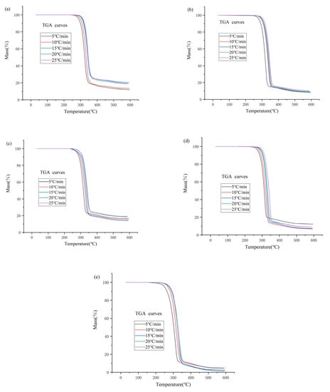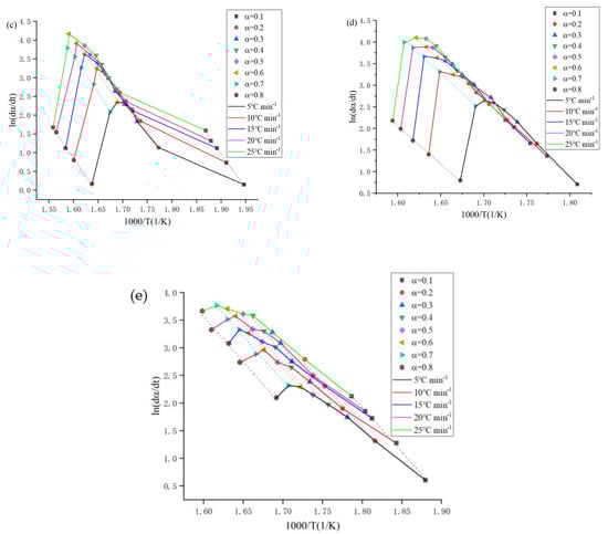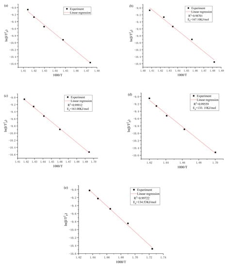 3] can be obtained by Equation (3) of the Kissinger method and the fitting linear slope calculation as 205.00 ± 8.17, 167.10 ± 9.05, 161.00 ± 6.80, 150.10 ± 7.68 and 134.53 ± 6.95 kJ/mol, and the corresponding R