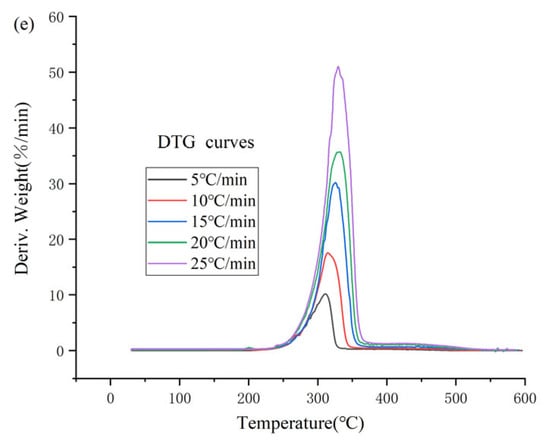 Figure 2, it is obvious from the DTG curves that the thermal decomposition reaction process of all the five ionic liquids is one-step decomposition. The shapes of the DTG curves obtained for the 1-alkyl-2,3-dimethylimidazole nitrate ionic liquids at different temperature ramp rates of 5, 10, 15, 20 and 25 °C/min are generally consistent; the DTG curves shift to the right, and the peak widths become narrower with increasing ramp rates. This may be the result of the shortening of the thermal decomposition reaction time due to the increase of the temperature rise rate.