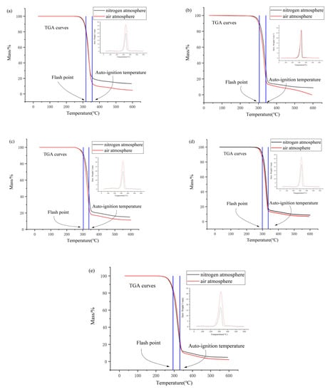 To better fit the actual industrial ionic liquids fire and explosion-proof intrinsically safe design and the selection of safety facilities and equipment, other conditions are the same as the nitrogen atmosphere experimental conditions. A temperature rate of 10 °C/min in the air atmosphere conditions of 1-alkyl-2,3-dimethylimidazole nitrate ionic liquids TGA experiments was used, and the experimental results and nitrogen atmosphere experimental results were compared. The TGA–DTG curve graph is shown in