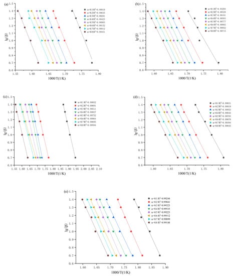 Based on the results of TGA curves for different heating rates of 5, 10, 15, 20 and 25 °C/min in nitrogen atmosphere, the experimental results of conversion α in the interval range of 0.1–0.8 with each group interval of 0.1 were selected as the base datausing MATLAB 2019b (MathWorks company, Natick, American) program, and the mathematical least-squares method was introduced to bring in the experimental data for fitting to plot the relationship between the