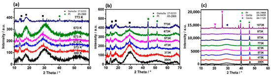 The in situ x-ray diffraction patterns of GexAsySe1−x−y thin films were measured by the X-ray diffraction (XRD) up to temperature (773 K or 1073 K) in vacuum (10−1 Pa) measured at room-temperature. (a) Ge20As10Se70, (b) Ge17.5As11Se72.5 and (c) Ge33As12Se55.