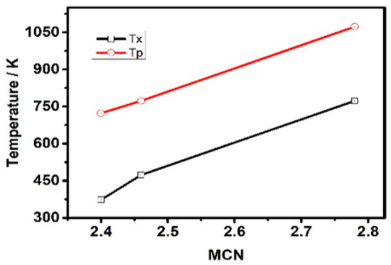 Two transition temperatures (the onset crystallization temperature Tx and peak crystallization temperature Tp) as a function of MCN (Mean Coordination Number).