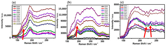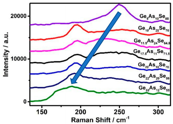 The red arrow indicates the location of the new peak. When the temperature rose to 423 K, the red scissors showed that the new peak appeared near 173 cm−1 in Figure 5a,b, 231 cm−1 and 221 cm−1 in Figure 5c. The new Raman modes of Ge−Ge homopolar bond were observed in Ge20As10Se70 and Ge17.5As11Se72.5 samples, A1(ν2) modes of As4Se3 cage-like molecules in Ge33As12Se55 sample.