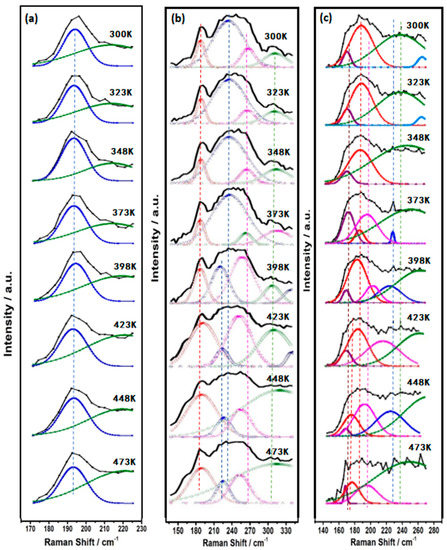 The set of in situ Raman spectra of GexAsySe1−x−y thin films up to temperature (473 K), decomposing the spectra into individual peaks. (a) Ge20As10Se70 (b) Ge17.5As11Se72.5 (c) Ge33As12Se55 and Ge20As10Se70.