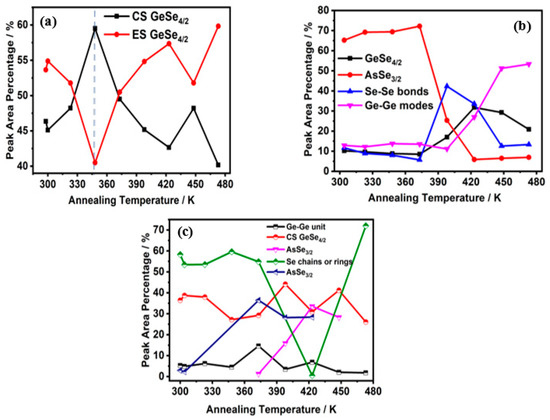 To see the evolution of the bonds with increasing annealing temperature clearly, Figure 7 presents the relative ratio of the area of each decomposed peak to the entire integrated area of Raman spectra as a function of annealing temperature. Obviously, GeSe4/2 bonds existed in all cases, and the content was not less than 30%. The percentage of new peaks mentioned in Figure 5 was too small compared with the original area, so they did not appear in Figure 6 and Figure 7. For Ge20As10Se70 film, the GeSe4/2 Corner-sharing (CS) mode and GeSe4/2 edge-sharing (ES) mode transformed each other near the glass transition temperature. For Ge17.5As11Se72.5 film, the contribution of Ge–Se increased while that of As–Se decreased. Specifically, the content of Ge−Ge bonds changed from 13% up to about 53%. At the same time, the content of the Se−Se bond decreased from 42% to 13%. For the Ge33As12Se55 film, the contribution of Se–Se and As–Se bonds were converted to each other. As one fell, another rose. Homopolar Ge−Ge and Se−Se bonds all existed in both of rich-Se film Ge17.5As11Se72.5 or rich-Ge film Ge33As12Se55. With the increase in temperature, chemical bonds affected or inhibited each other near the glass transition temperature.