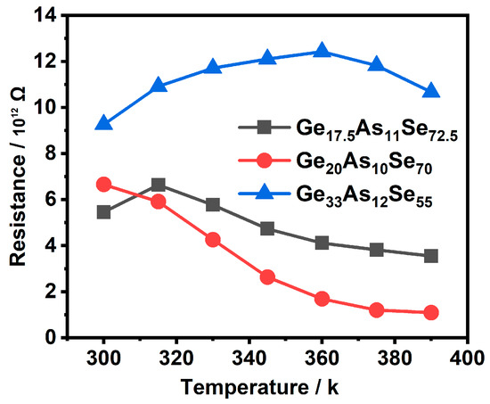 The resistance decreased with the increase in annealing temperature in Ge20As10Se70 film, as shown in Figure 8. With the increase in annealing temperature, the resistance increased first and then decreased in rich-Se Ge17.5As11Se72.5 film and rich-Ge Ge33As12Se55 film. For rich-Se and rich-Ge films, the nonequilibrium minority carriers were Ge−Ge or As−As bonds. Specifically, the number of Ge−Ge bonds of Ge20As10Se70 was relatively small, so the electrical properties changed greatly.