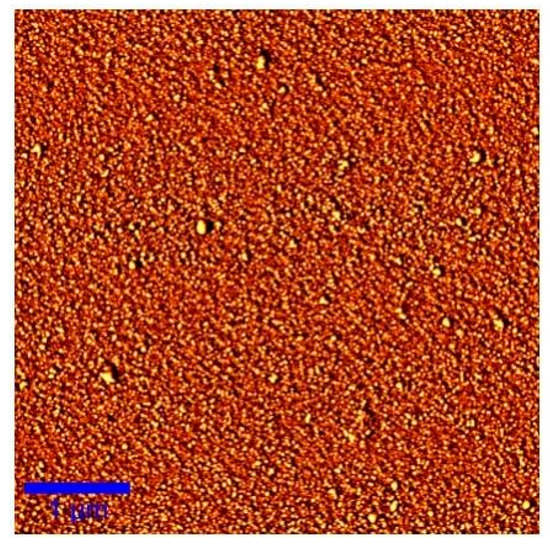 The AFM image of the Ge17.5As11Se72.5 thin film is demonstrated in Figure 9. The whole image was taken at a scale of 1 × 1 μm. The surface morphology of the films was compact and uniform. The larger particles on the film surface were also found, which were the impurity particles absorbed on the film surface during thermal evaporation. On the whole, the preparation of the thin film was successful without big defects. The uniformity of morphology also indirectly indicated that the microstructure of the material was stable, and its transmission characteristics should be kept at a certain value.