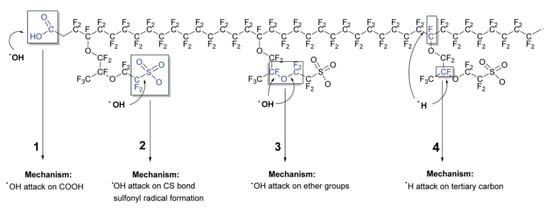 Compared with mechanical degradation, chemical degradation is a slow process. After a period of operation, the chemical degradation of PEM is mainly as follows: the proton conductivity decreases, and the fluorine ion release rate and gas permeability increase [23,24]. So far, the mechanism of membrane chemical degradation has been not yet fully understood. Researchers believe that chemical degradation mechanisms usually involve formation of radical chemical species by electrochemical reactions, such as hydroxy (HO.), hydroperoxyl (HOO.) and hydrogen (H.), which are generated as reaction by-products. The radical chemical species will attack the carboxylic acid end group sites of the primary chain and sulfonic acid groups from the side chain, leading to the chemical bonds’ cleavage and the expansion of defects [5,25]. The enlarged defect will significantly accelerate the overall rate of membrane degradation. As shown in Figure 3, there are four main mechanisms of radical attack on the Nafion polymer structure: carboxylic acid end groups; C–S bonds; tertiary carbon atoms and ether groups [25].