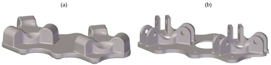3D models of the forging of aircraft mount from AZ61 alloy (a) and of the finished aircraft mount (b).