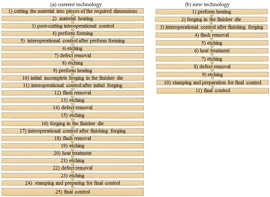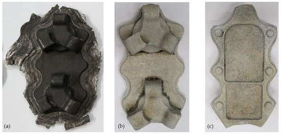 The research concentrated on a new forming process of forging an aircraft mount (Figure 1a) manufactured from a billet in the form of a sand-cast preform from a high-strength AZ61 grade magnesium alloy. Currently, aircraft mounts presented in Figure 1b are manufactured by machining from cast elements or by multi-stage forging from wrought billet [28,29,30,31]. This technology is particularly time, labor, and energy-consuming. Moreover, it generates significant material waste, while the quality of the finished product is low. Among other manufacturing methods, there is a die forging of a wrought billet. In this method, limits to the usage occur since it is difficult to produce elements from less plastic magnesium alloys. The process is conducted in many stages (Figure 2a), leaving a significant stock allowance. Approximately 50% of the forging mass is technological waste created in several forging operations and numerous heating operations. In the die forging of mounts from less plastic magnesium alloys, it is often necessary to obtain additional dies for initial forging. This technology is also very material-, labor- and energy-consuming, as well as limitedly effective.