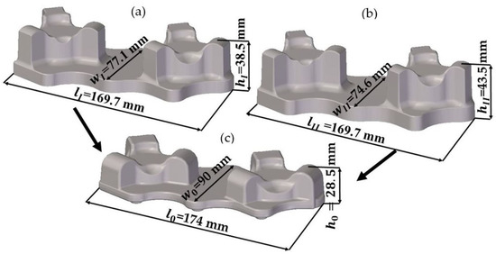 Model 3D of the parts: (a) variant I-preform with a smaller forging ratio, (b) variant II-preform with a higher forging ratio, (c) forging.