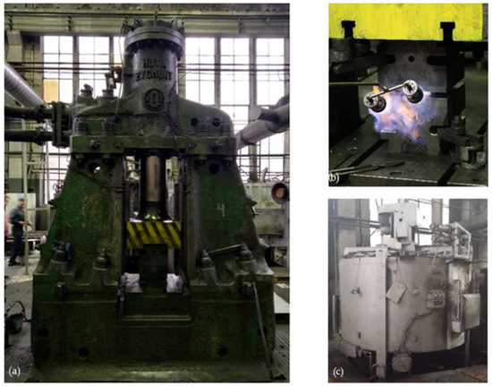 Machines used during tests in industrial conditions: (a) MPM 3150 drop hammer, (b) gas burner, (c) electric furnace.