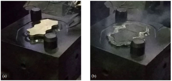 The experimental tests of the new process of forming forgings of aircraft mounts from AZ61 alloy castings were carried out in industrial conditions at ZOP Co. Ltd. FORGING PLANT (Świdnik, Poland). All forging tests were performed on an MPM 3150 die hammer (Huta Zygmunt, Poland) (Figure 6a) using a set of dies shown in Figure 7 and the conditions assumed in computer simulations (Section 2.1). The dies were heated in the furnace to the temperature of 250 °C, and during the tests, their temperature was maintained using gas burners (Figure 6b). The preforms were heated to the forging temperature of 400 °C in a PEO-A1-type rotary electric furnace with forced air circulation (ELTERMA Świebodzin, Poland) (Figure 6c). After obtaining the appropriate thermal conditions, the preforms were forged in a single operation in a finishing impression (Figure 7). Correct forgings of aviation mounts were trimmed from the flash using a saw and then etched in five baths with the parameters presented in Table 2. Then, the forgings were heat-treated in the form of supersaturation at T = 415 °C for 6 h and cooling in water and aging in temperature T = 175 °C for 24 h and cooling in air.