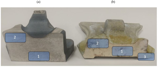 To assess the quality of the formed AZ61 alloy forgings of aircraft mounts obtained during industrial tests, the structure, electrical conductivity and mechanical properties were tested. The macrostructure tests were carried out in the cross-section of the mounting rib (Figure 8) for cast preforms, homogenized cast preforms, forgings after forging as well as forgings after forging and heat treatment, respectively. First, cross-sections were made, which were subjected to the process of grinding and polishing. Initially, grinding was applied on a SiC-coated abrasive disc with a grain size of 400 for 3 min. Then, polishing with a diamond suspension of 9 µm was applied for 3 min. The next step was polishing using a diamond suspension with a grain size of up to 3 µm for 3 min. Then polishing was carried out with colloidal silica with a grain size of 0.05 µm for 3 min. Between each step, the samples were rinsed substantially with alcohol to counteract surface oxidation. After the polished sections were made, the samples were etched by immersion and gentle stirring for 5–15 s in a solution of 100 mL ethanol, 10 mL distilled water, 10 mL acetic acid, and 5 g picric acid etchant.