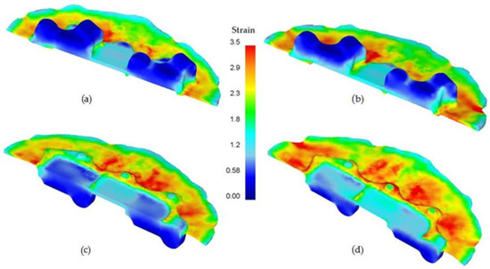 Distribution of the effective strain in the cross-section of the AZ61 aircraft mount: (a) lower degree of forging–top of the forging, (b) a higher degree of forging–top of the forging, (c) lower degree of forging–bottom of the forging, (d) higher degree of forging–bottom of the forging.