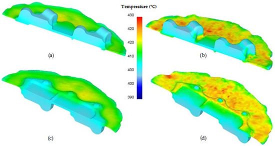 Distribution of temperature in the cross-section of the AZ61 aircraft mount: (a) lower degree of forging–top of the forging, (b) higher degree of forging–top of the forging, (c) lower degree of forging–bottom of the forging, (d) higher degree of forging–bottom of the forging.