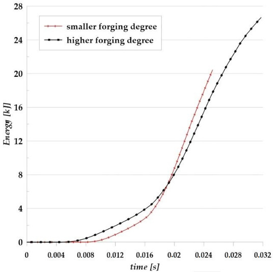 FEM analysis allowed to determine the forming energy (Figure 13) occurring during forging in the die hammer in a finishing die from two designed preforms. The maximum energy needed to obtain the forging from the first (smaller) variant was approximately 21 kJ, and for the second variant, approximately 27 kJ. This justifies the conclusion that the hammer on which the process was carried out was appropriately selected.
