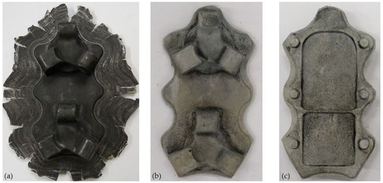 The results of experimental tests carried out in industrial conditions confirm the good deformability of the AZ61cast magnesium alloy and the possibility of producing aircraft mounts from both geometry variants of the cast-shaped preforms. Figure 14 and Figure 15 show the forgings obtained for both variants of the preforms: a lower degree of forging (Figure 14) and a higher degree of forging (Figure 15). After the visual inspection of the forgings obtained after trimming the flash and etching (Figure 14b,c and Figure 15b,c), no laps or other surface defects were found, proving that the correct products were obtained.