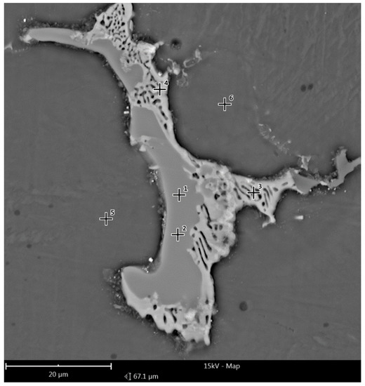 Figure 16 and Figure 17 show the reference area of the preform variant I cross-section; (a) as-cast, (b) homogenized, used to analyze the chemical composition in micro-areas. The figure shows the points where the microanalysis was performed. The measurement results are summarized in Table 4.