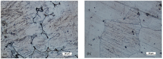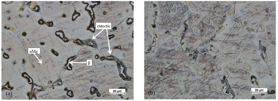 All raw castings had a homogeneous structure throughout the tested cross-section. This structure was characteristic of this as-cast alloy and was dendritic. It consisted of chain precipitates of intermetallic phased, most of which were β phase (Mg17Al12) surrounded by eutectic precipitated. The alloy matrix was a solid solution of αMg. After homogenization of the castings, grain growth was visible, with the dissolution of most of the precipitates in the alloy matrix.