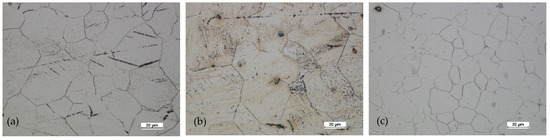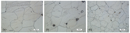 After heat treatment, the grain regrowth was noticed. However, it was not as significant as after homogenization. Lenticular secondary precipitated were visible (discontinuous). In all areas, the grain size was similar, and its shape was regular.