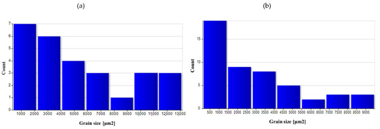 Grain surface distributions for the analyzed areas marked in Figure 8: (a) preform I as-cast in area 1, (b) preform I after homogenization in area 1.
