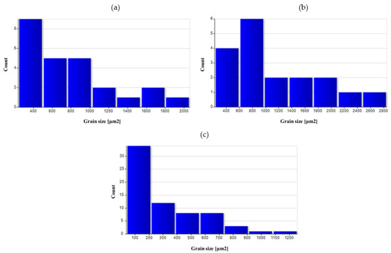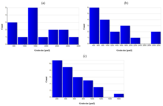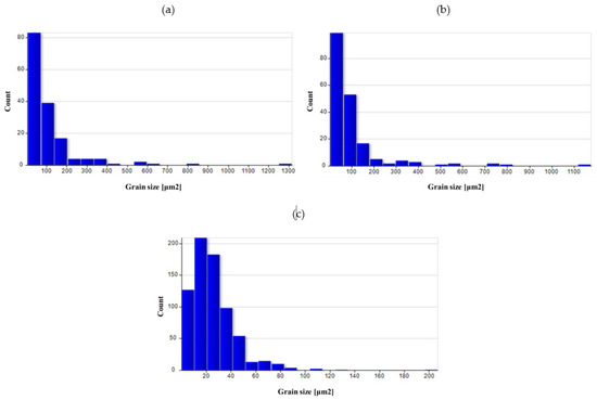 Grain surface distributions for the analyzed areas marked in Figure 8: (a) forging II heat-treated area 1, (b) forging II heat-treated area 2, (c) forging II heat-treated area 3.