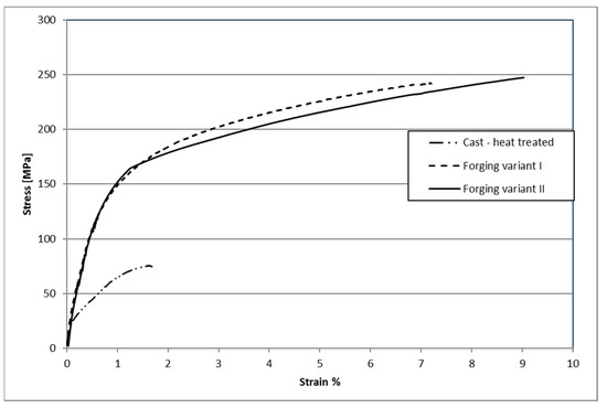 Figure 31 shows example curves obtained during the static tensile test on the testing machine of samples made of AZ61 alloys. The analysis of the curves obtained in the static tensile test showed that the samples made of castings and subjected to the heat treatment process showed the smallest plasticity and tensile strength. The forgings after heat treatment were characterized by much higher strength and elongation. There were no significant differences between the samples forged using the lower and the higher preforms. The minimally higher values were in forging forged from a preform with a higher degree of forging.