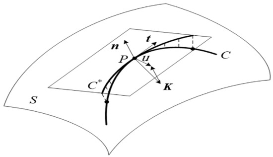 Let point P be any point of the curve (C) on the surface S, as shown in Figure 1. The curvature vector is K, t is the unit tangent vector, and n is the unit normal vector of the surface S at the point P. Among them, , so three unit vectors t, n, and u are perpendicular to each other and conform to the right-hand rule. According to the theory of differential geometry, curvature vector K can be expressed in two parts: the projection on n is called normal curvature Kn, and the projection on u is called geodesic curvature Kg. Additionally, then the curvature vector K can be written as [15] follows: