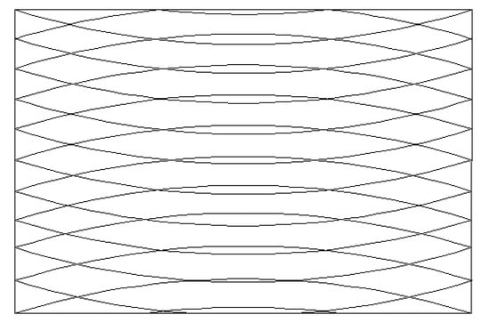 The difference between a variable angle laminate and a conventional laminate is that the fiber angle of each laminate is not fixed but constantly changing on the basis of variable angle placement. Gürdal [16] further proposed a trajectory path design method, which is suitable for variable angle curve fiber placement, as shown in Figure 4. The angle between fiber direction and axis is linear with the reference geometry axis, so the path of reference trajectory can be determined.