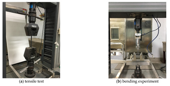 In this experiment, the relevant specimens were prepared with reference to the Testing Standard for Mechanical Properties of Advanced Composite Materials. The tensile test piece was a rectangular specimen of 250 mm × 15 mm × 1.25 mm, and in order to minimize the experiment error, two reinforcing pieces with the size of 56 mm × 15 mm × 1.25 mm were attached at both of the ends of the specimen. During the process, the crosshead movement speed was 2 mm/min. The tensile test process is shown in Figure 10a. The bending test piece was a rectangular specimen of 40 mm × 13 mm × 1.25 mm, which was loaded at three points and the loading speed is 1 mm/min. The bending test is shown in Figure 10b. According to the standards above, five specimens were prepared for the laminates with a straight line and different geodesic curvature curves. Additionally, the five test specimens were divided into a group for labeling and classification.