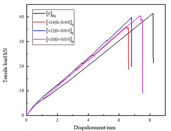 Tensile load–displacement curve of linear layup and curved layup specimens.