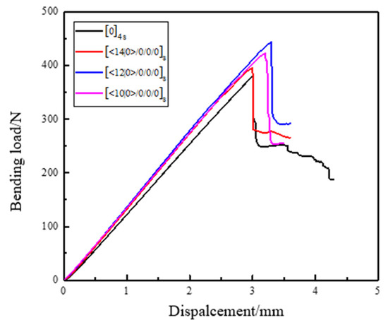 According to the calculation of Equation (9), the bending strength of specimens of traditional laminates with [0]4s linear laminates is 1126.42 MPa. The bending strength of the laminate specimens with different geodesic curvature curves of [14|0>/0/0]s, [12|0>/0/0/0]s, [10|0>/0/0/0]s is, respectively, 1168 MPa, 1314 MPa, and 1249M Pa. It can be clearly found from Table 2 that compared with the traditional laminates with straight-line laminates [0]4s, the bending strength of the laminates with varying angles of different geodesic curvature curves [<14|0>/0/0]s, [<12|0>/0/0/0]s and [<10|0>/0/0/0]s has been significantly improved. Among them, the [<12|0>/0/0/0]s laminates with a radius of curvature of 1000 mm have the highest bending strength, with an increase of 16.68%. The geodesic radius of curvature is 800 mm [<14|0>/0/0/0]s laminates have less increase in bending strength, but also have an increase of 3.724%. This is because, compared to the linear layup, the curve layup is longer and the span is larger in the same size. Additionally, the force distributed on the fiber per unit area is smaller with the same applied load. The fiber angle in the curve layer varies with the position so that the stress distribution inside is adjusted, and the stiffness distribution is optimized. Therefore, the failure performance is improved. In addition, since the fibers in the curved layer are curved, the fibers per unit area are longer than the linear layer. When subjected to the external bending load, the specimen fibers of the linear layer will be directly stressed, the upper layer will be subjected to compressive stress, and the lower layer will bear the tensile stress. Therefore, failure will gradually occur. For the specimen fibers with curved layers, there will be a process from bending to straightening. When they are subjected to the same bending load, they can bear more deflection than those with straight layers. Therefore, they can bear more ultimate failure load and bending strength. However, when the geodesic curvature of the fiber trajectory exceeds a certain value, the bent fibers cannot be completely retained in the prepared curved layer specimen. The fiber is truncated in the specimen, so compared with the specimen with small geodesic curvature, its performance is decreased. In conclusion, variable angle laminates with different curvatures can effectively improve their ultimate load. When the composites are subjected to bending load, the mechanical properties of composites can be effectively improved by varying the angle of curvature.