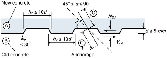 here, and are the coefficients expressing the interfacial state, is the design tensile strength of concrete, is the compressive stress acting vertically across the entire cross section, is the shear connector angle, is the strength softening factor, and is the design compressive strength of concrete.