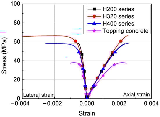 Eighteen concrete cylinders, measuring Φ100 mm × 200 mm, were fabricated for testing to estimate the compressive strength of HCS and topping concrete and the curing was performed under the same conditions as specimens [27,28]. The compressive strength of concrete was matched to failure of each specimen and the results are shown in Table 2 and Figure 2. During the tests, the age of concrete is 28–32 days for the HCS and 21–25 days for topping concrete, according to the experimental schedule. The stress-strain relationship of concrete shown in Figure 2 was obtained from readings of strain gauges attached in the longitudinal and lateral directions of the concrete cylinders. The compressive strength of concrete is shown in Table 2. For HCS, the average compressive strengths were 56.6 MPa for the H200 series, 51.8–62.6 MPa for the H320 series, and 51.7 MPa for the H400 series. All average compressive strength values were higher than the design strength. The average compressive strengths of topping concrete were 38.9 MPa for the H200 series, 32.1–33.7 MPa for the H320 series, and 35.9 MPa for the H400 series.