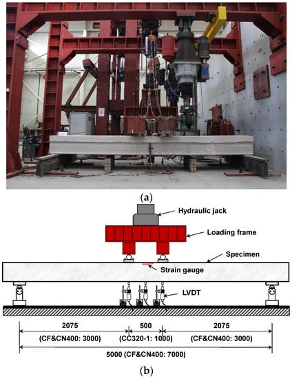 Test setup of specimen (unit: mm): (a) photograph; (b) elevation view.