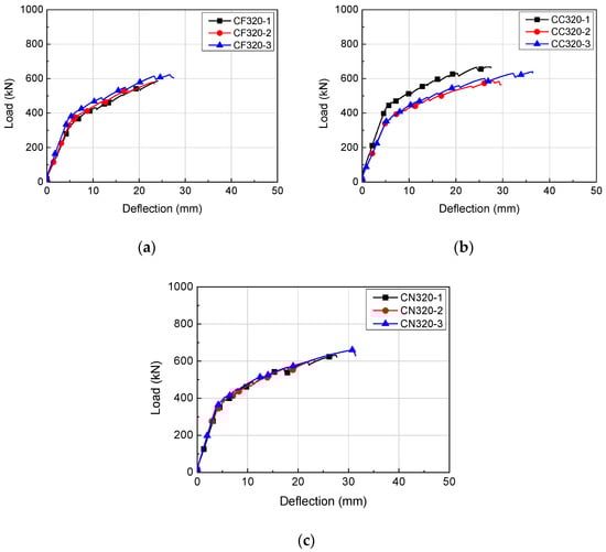 Load-deflection relationships of H320 series: (a) CF320; (b) CC320; (c) CN320.
