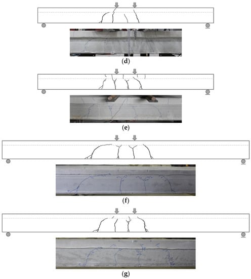 Crack patterns of specimens at peak load: (a) CF200-1; (b) CN200-1; (c) CF320-3; (d) CC320-3; (e) CN320-3; (f) CF400-1; (g) CN400-1. The photographs were the crack patterns of specimens at the end of the loading.
