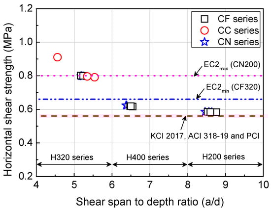 The experimental results showed that the CC series and CN series, with interface roughness achieved by applying grooves in the member length direction, had superior deformation performance, flexural strength, and structural performance compared to the CF series, in which grooves were applied in the member width direction. The application of interface roughness in the lengthwise direction is presumed to facilitate force transfer, but further research should be conducted using diverse variables for more accurate prediction. Another possible direction is to explore methods of evaluating the horizontal shear strength of specimens with interface roughness applied in the lengthwise direction. As shown in Figure 11, the horizontal shear strength acting at the interface during the flexural failure decreased with increasing shear span to depth ratio (a/d) regardless of interface roughness direction and shape. If the flexural behavior is dominant, it is considered necessary to secure sufficient horizontal shear strength for fully composite.
