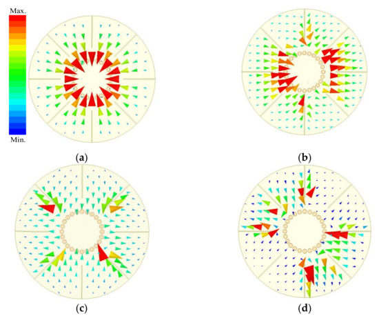 To study the useful resonances in wideband BPF design, the proposed resonator is excited by microstrip line. It is analyzed under weak capacitive coupling to investigate the electric field and surface current distributions of the excited resonant modes by the microstrip line, which are shown in Figure 3. As shown in Figure 3, the feeding lines excite resonances with the same electric field directions in the connecting region between the resonator and the feeding lines. Because each section of the resonator departed by the eight grooves has different electric field directions when the resonator works at the M4 mode, the connecting point has two opposite electric field directions, as shown in Figure 4. As a result, the M4 mode cannot be excited.