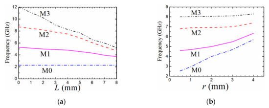 The grooves introduce major obstacles in the current paths of the M1, M2, and M3 modes, while they have no effect on the fundamental M0 mode as shown in Figure 5. Therefore, the grooves can bring down the resonant frequencies of the M1, M2, and M3 modes as shown in Figure 6a, where L1 = L2 = L. The longer the grooves are, the longer the currents of M1, M2, and M3 flow, which results in drawing down of the relevant frequencies. In addition, the radius of the inner circle r has great effect on the current distributions of M0 and M1 modes as shown in Figure 5a,b, which is also displayed in Figure 6b. The resonant frequencies of M0 and M1 modes grow larger when r increases while the resonant frequencies of M2 and M3 modes increase a little.