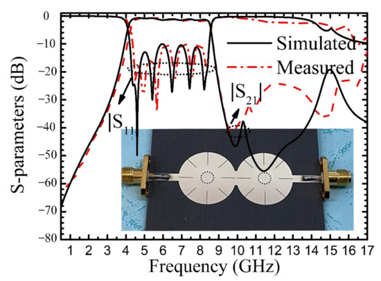 Three filters have been designed for the verification of the theoretical analysis in Section 5. The first filter (BPF-I) has a passband from 4.21 to 8.75 GHz with center frequency (f0) of 6.5 GHz and a 3-dB FBW of 70%. The final dimensions are optimized by the full-wave electromagnetic simulation software ANSYS, which are R = 10 mm, r = 2.4 mm, L1 = 5 mm, L2 = 5 mm, and w = 0.1 mm. The 50 Ω feeding lines are directly connected to the resonator. The fabricated filter is shown in Figure 9 with frequency responses. The filter size is 0.65λg × 0.65λg, where λg is the guided-wavelength at the center frequency. The results not only demonstrate the analysis in Section 4, but also show good agreement between simulation and measurement in the working frequency range. The measured insertion loss (IL) at center frequency is 1.6 dB, which is caused by the radiation, dielectric, and conductor loss. The measured return losses are larger than 10.2 dB in the passband. The stopband with 20 dB suppression can be extended to 2.3 f0.