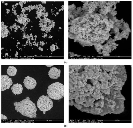 Mixed WC and Co powders were used in the tests. The powders used differed in the size of the primary WC particles. The particle size of one of them was ca. 1 μm (submicron), while that of the other was ca. 400 nm (ultrafine). Microscopic observations (using SEM–FEI QUANTA 200, FEI, Hillsboro, OR, USA) of powder with a particle size of 400 nm showed spherical agglomerates of about 20 µm. In contrast, the WC powder with a particle size of about 1 µm was characterized by an irregular shape, with only some powder particles forming irregular agglomerates of different sizes (Figure 1).