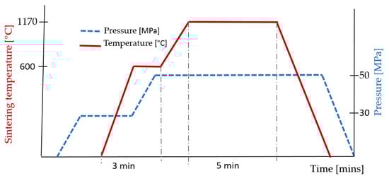 The WCCo carbide sintering process was carried out using a Spark Plasma Sintering (SPS, prototype device, Łukasiewicz Research Network - Institute of Electronic Materials Technology, Warsaw, Poland device, in two stages. The degassing stage was carried out at a temperature of about 600 °C for 3 min, increasing the uniaxial pressure from 30 to 50 MPa in the second minute. In the second stage, the sintering itself was carried out at 1170 °C for 5 min (Figure 2).