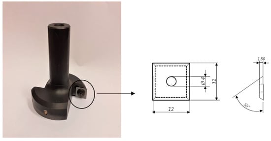 Two groups of WCCo tools manufactured using the SPS method and commercial tools of similar composition and properties were used in the tests. Durability tests were conducted on blades, with four cutting edges, measuring 12 × 12 × 1.5 mm and a blade angle of 55° (Figure 3).
