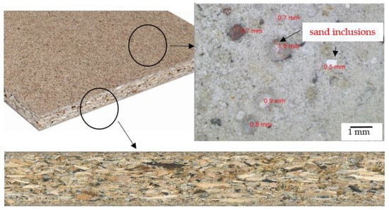 Raw three-layer chipboard (Figure 4) with a thickness of 18 mm was used to carry out the tests. Selected properties of the chipboard are summarized in Table 1.
