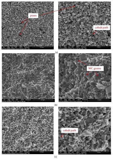 During the sintering process in general it’s not easy to control grain size. This can be referred to as plastic hot deformation of metals, and recrystallization process. As for the SPS, the technique is contrary to other technologies that give the possibility to work with the current parameters. The combination of impulse duration interval combination of time, temperature, and strains gives more possibilities of impact. As for the grain size, the fracture toughness and hardness are combined. The fracture toughness in general with the smaller grain, the larger/higher it is. But for sintered composites, these parameters have an influence also porosity and diffusion bonding. Therefore, even materials with very similar grain sizes made with different techniques can have very different mechanical properties. Porosity also influences the hardness. The hardness of submicron and commercial be taken as very similar. No pores were observed at the microstructure of the commercial samples. The sintering process of these materials was carried out using a traditional method involving the liquid phase. This is evidenced by, among others, cobalt, which is evenly distributed along the grain boundaries of the WC, as shown in the SEM photos of the microstructure of the received composites. The presence of a liquid phase introduces many changes in the course of powder densification processes and has a decisive influence on the course of sintering (densification).